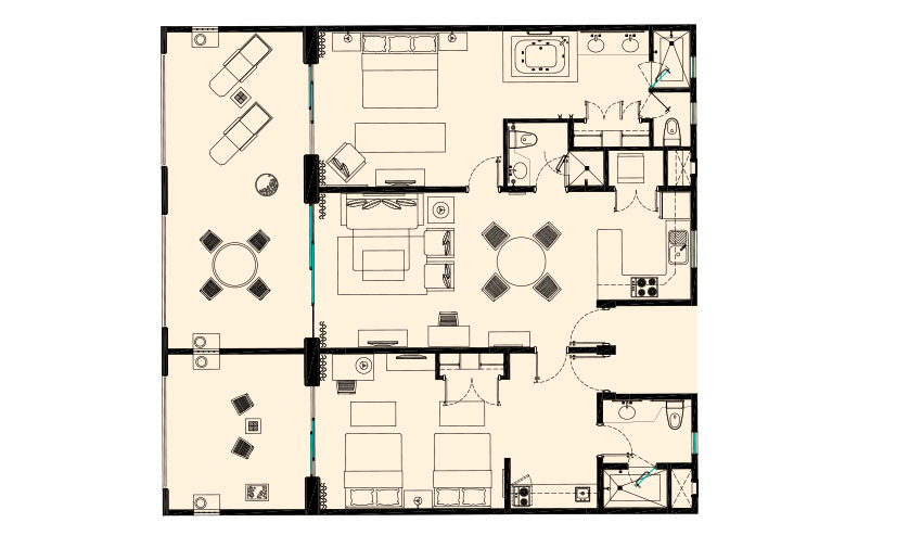 Refined and spacious, this premium suite invites you to indulge in the essence of elevated coastal living. Designed for families or friends, it features two beautifully appointed bedrooms and expansive living and dining areas that open onto private terraces framing spectacular ocean or golf course views. A fully equipped kitchen and the thoughtful touches of a residential retreat create a seamless blend of comfort and sophistication—ideal for those who seek both relaxation and style in paradise.