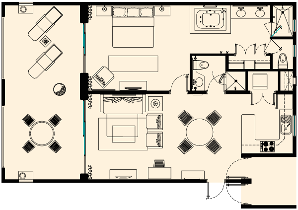 Enjoy the perfect blend of comfort and style in this spacious suite featuring a private bedroom, a full kitchen, and inviting living and dining areas. Step onto your terrace to take in beautiful views of the pool, gardens, mountains, or golf course.